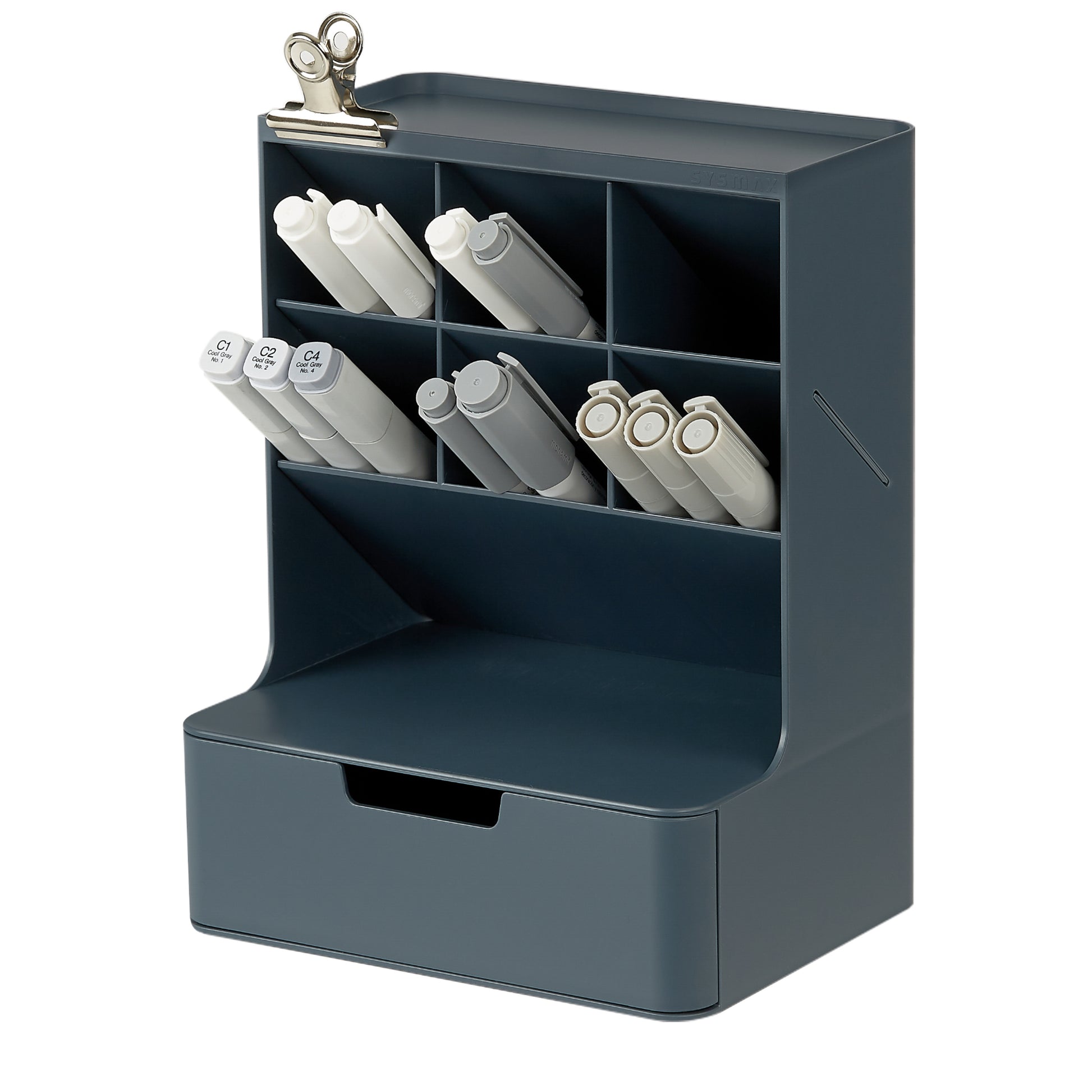 Maximize your space with this vertical organizer. Six angled compartments keep pens and markers visible and within reach. A top tray and middle shelf sort loose items, while a full-size drawer hides away the rest.