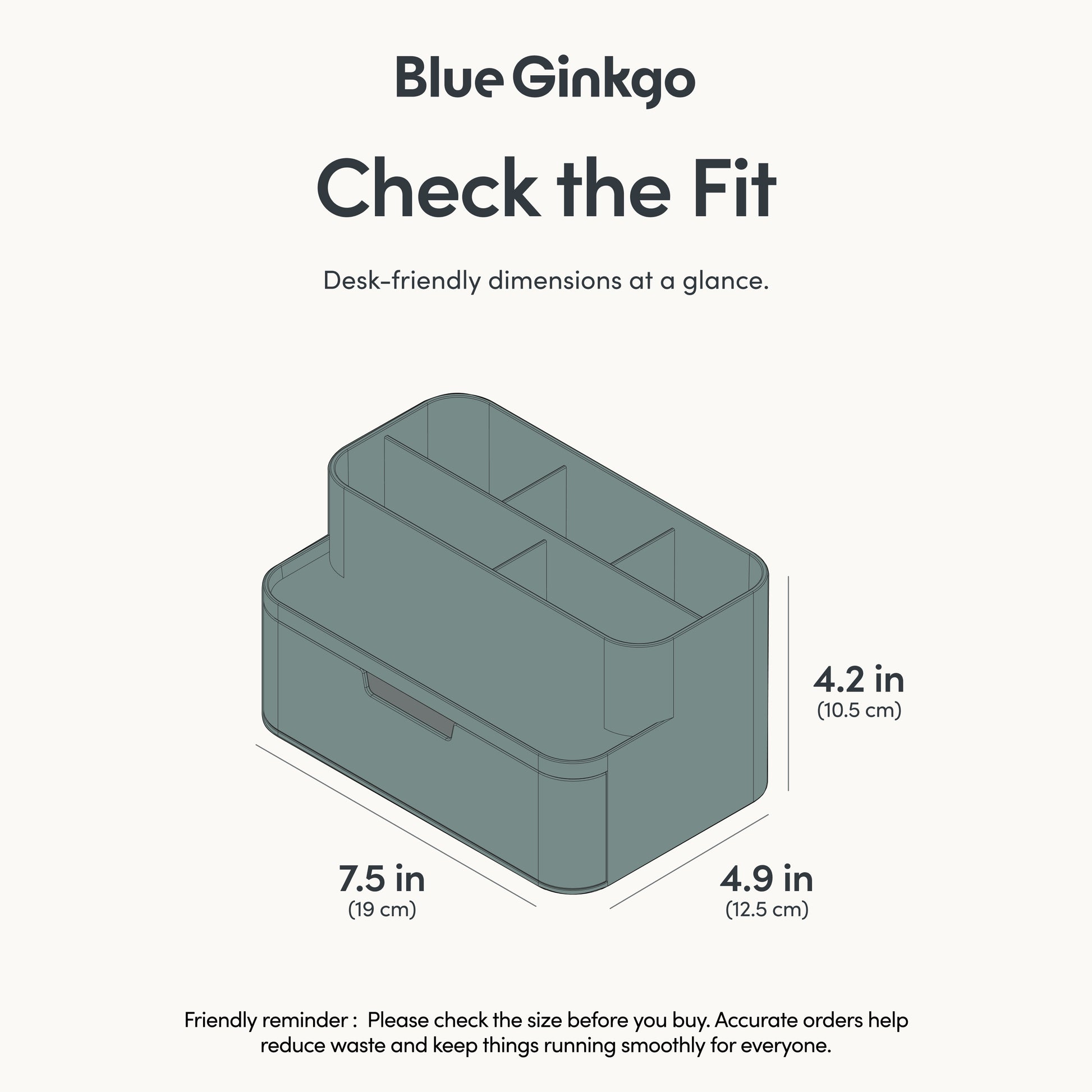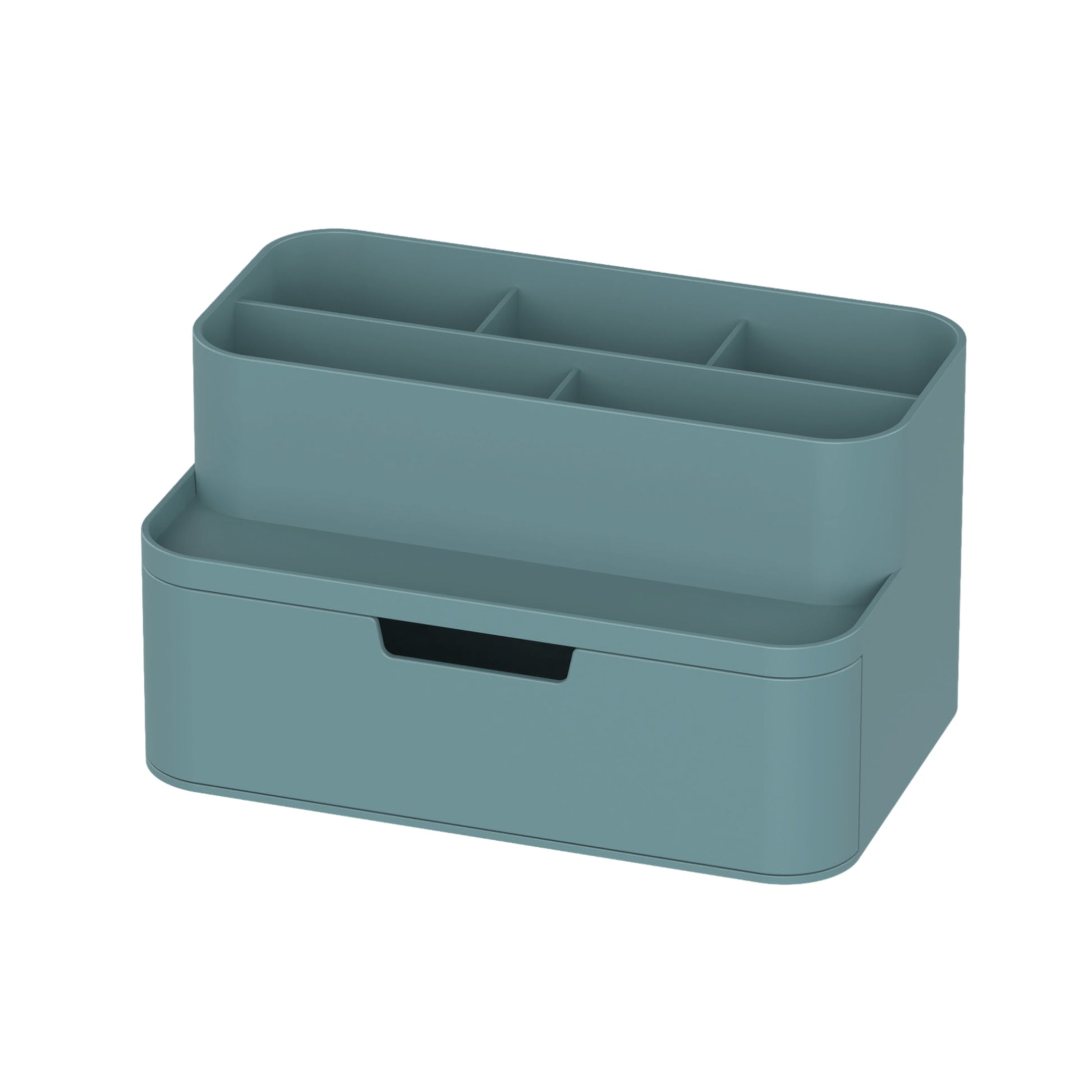 Designed for versatility in a small footprint. Three tall compartments organize pens and tools, while two smaller sections keep shorter items upright. A flat tray and smooth half-depth drawer give you extra room for the little things.