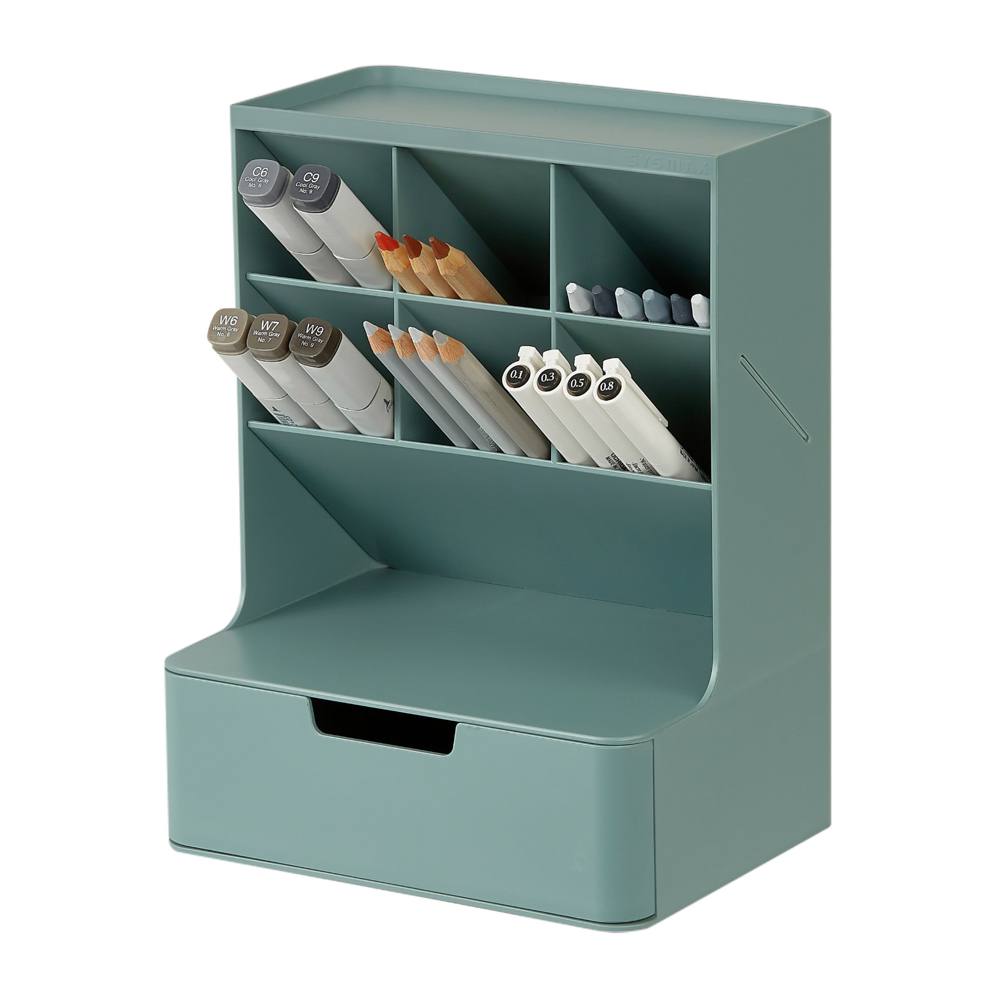 Maximize your space with this vertical organizer. Six angled compartments keep pens and markers visible and within reach. A top tray and middle shelf sort loose items, while a full-size drawer hides away the rest.