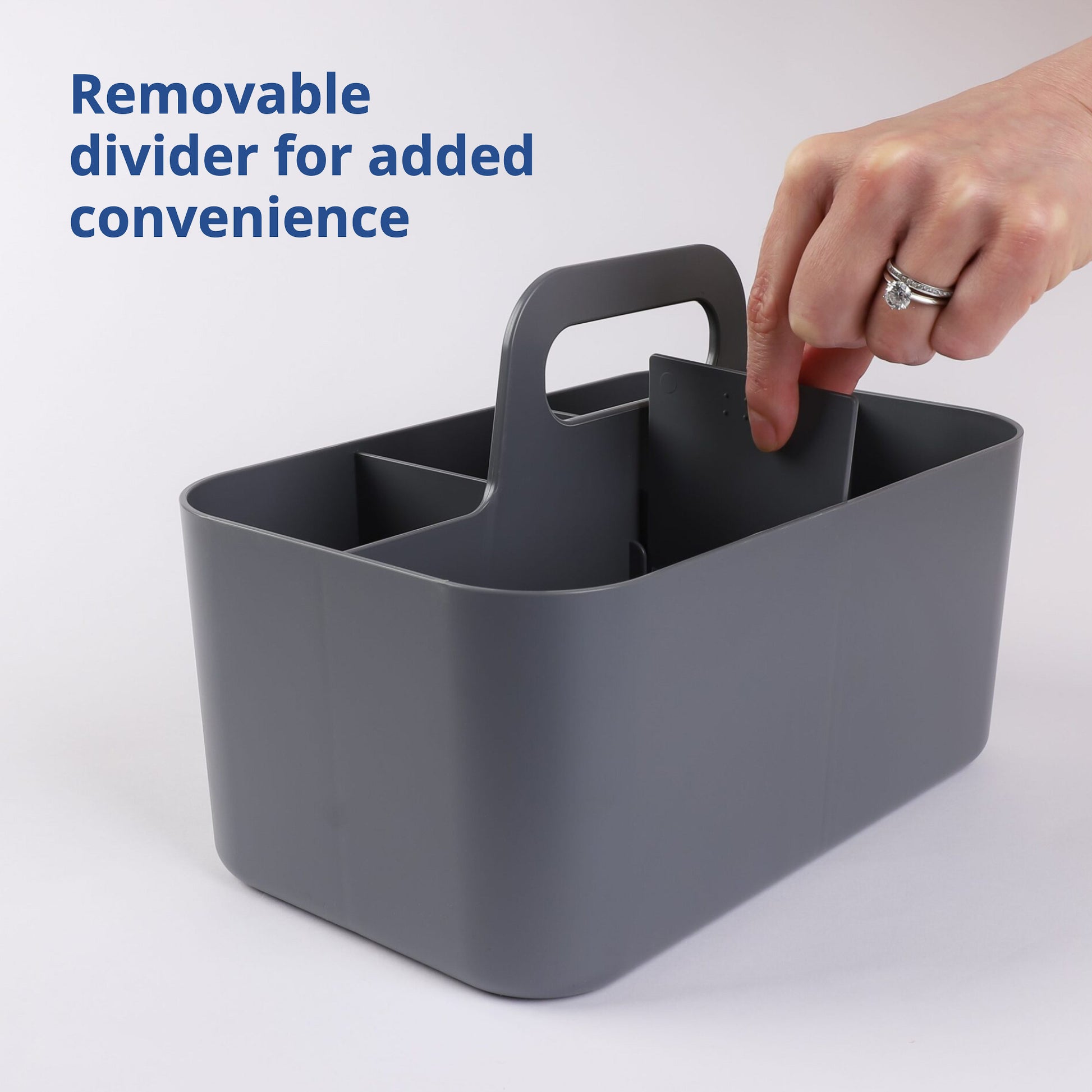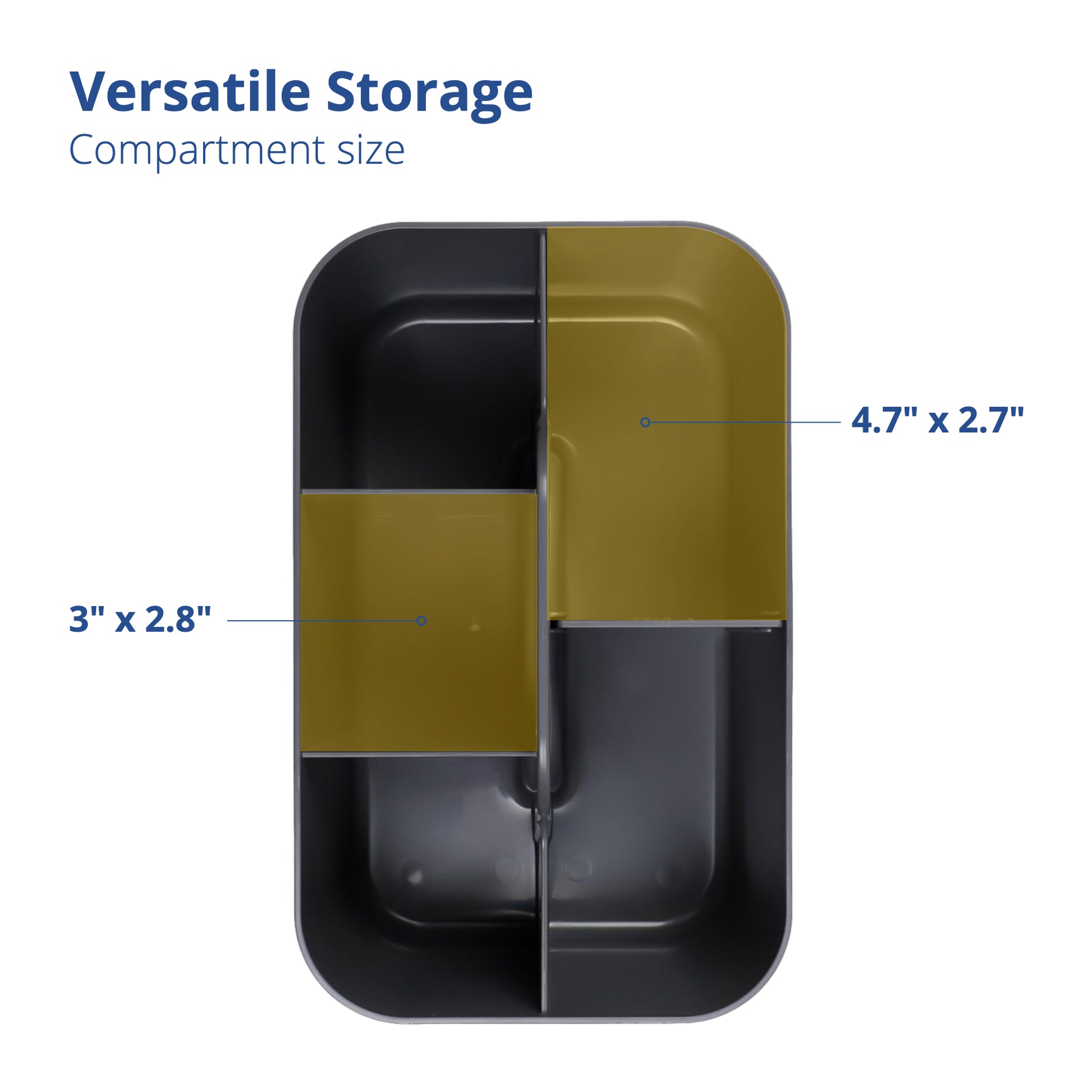 This rectangular caddy has up to five compartments with one removable divider. When the divider is removed, the smallest compartment measures approximately W3 x D2.9 inches, and the largest measures W9.5 x D2.9 inches.