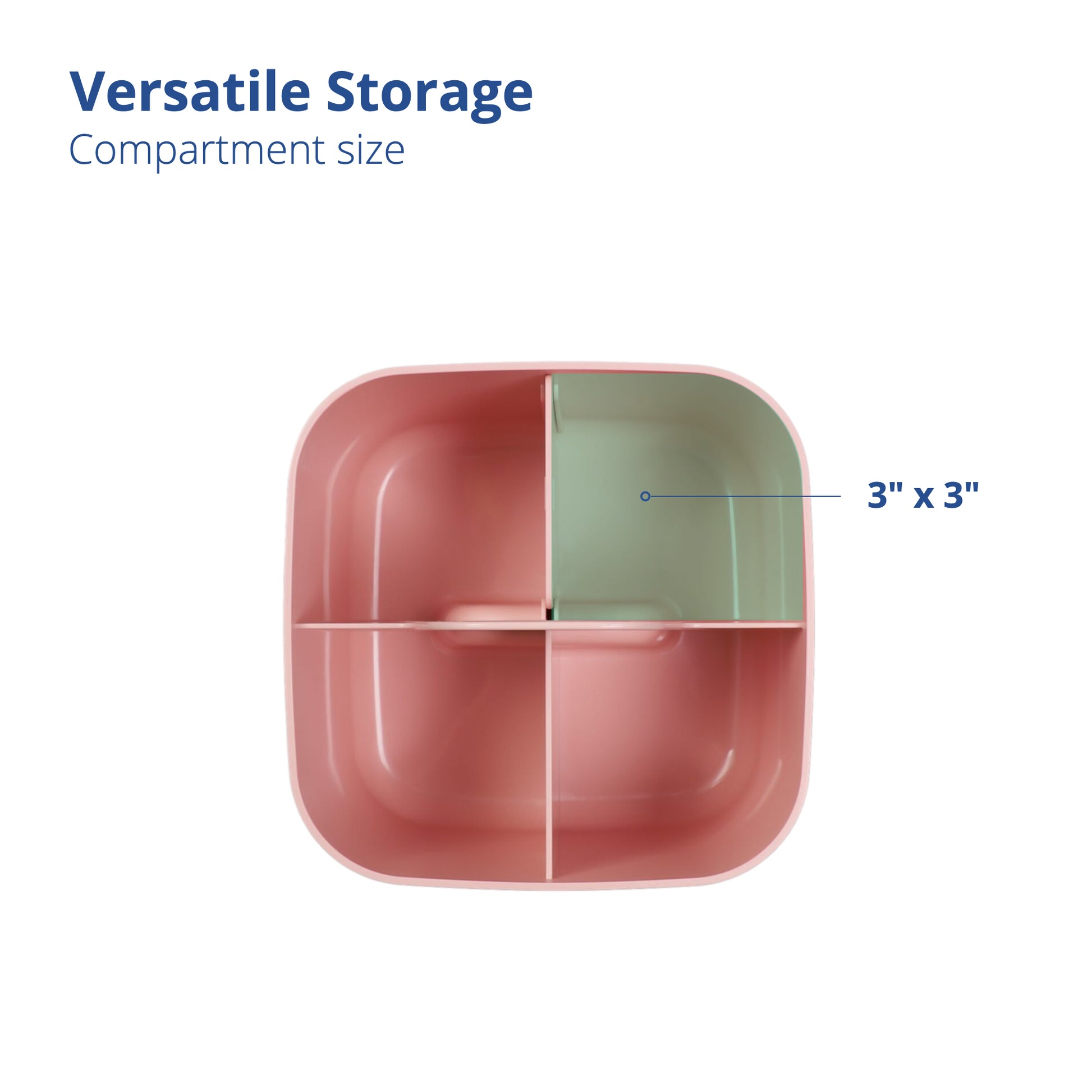 This square caddy has up to four compartments with one removable divider. When the divider is removed, the smallest compartment measures approximately W3 x D3 inches, and the largest measures W6.2 x D3 inches.